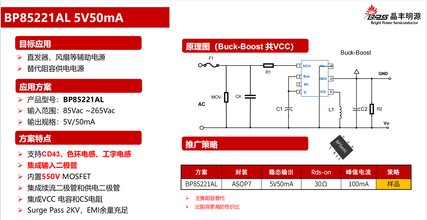 在電源設(shè)計(jì)領(lǐng)域,阻容降壓芯片因其簡(jiǎn)單性和成本效益而被廣泛使用。然而,隨著電子設(shè)備對(duì)電源效率和穩(wěn)定性要求的提高,傳統(tǒng)的阻容降壓方案逐漸暴露出其局限性。BP85221AL,作為一款高效的降壓型開(kāi)關(guān)穩(wěn)壓器,提供了一種完美的替代方案,以滿足現(xiàn)代電源設(shè)計(jì)的需求。本文將探討B(tài)P85221AL如何實(shí)現(xiàn)對(duì)阻容降壓芯片的完美替代,并分析其在電源設(shè)計(jì)中的優(yōu)勢(shì)。