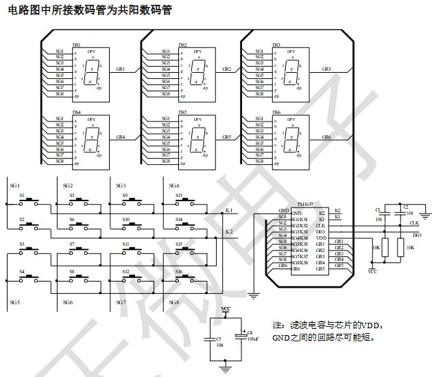顯示模式(8 段×6 位),支持共陽數碼管輸出