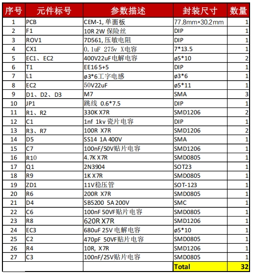 PCB設計是電源性能的重要保障。在本設計中,PCB采用CEM-1單面板,尺寸為77.8mm×30.2mm。在布局上,輸入端和輸出端盡量遠離,以減少干擾。高頻元件如變壓器、MOSFET等盡量靠近電源芯片,以縮短走線長度,降低寄生參數的影響。同時,合理安排地線和電源線的布局,確保電源的穩定性和可靠性。