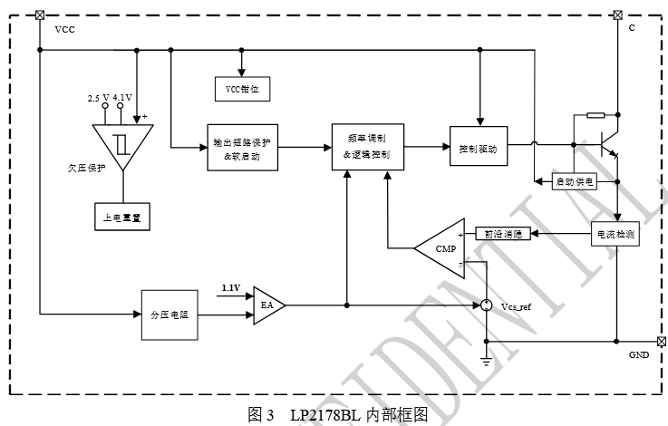 LP2178BL的啟動過程非常簡潔。芯片僅需1uA的啟動電流,系統(tǒng)上電后,通過內(nèi)部啟動供電電路對VCC的電容進行充電。當VCC電壓達到芯片開啟閾值時,內(nèi)部控制電路開始工作,輸出電壓開始上升并建立。在輸出電壓穩(wěn)定后,VCC由輸出電壓供電,確保系統(tǒng)的持續(xù)運行。