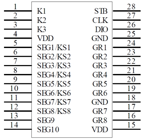 | 28 | STB | 片選,上升或下降沿初始化串行接口 |