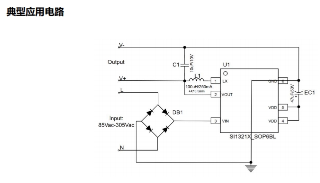 SI1321X系列芯片設(shè)計注重緊湊性與易用性,兼容CD32/43貼片電感和0410色環(huán)電感,無需額外的π型濾波或安規(guī)電容即可滿足EMI標準,大大簡化了電路設(shè)計。此外,輸入端免去了高壓電解電容的使用,進一步降低了成本和體積,使得該芯片在空間受限的應(yīng)用場景中更具優(yōu)勢。