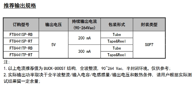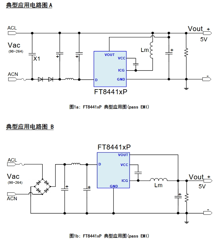 FT8441TP 的典型應用電路圖展示了其在實際應用中的簡潔性和高效性。圖 1a 和圖 1b 分別展示了兩種典型的應用場景,均能夠通過簡單的電路設計實現穩定的 5V 輸出。在這些電路中,FT8441TP 的各個管腳連接明確,輸入端接入 90-264V 的交流電壓,經過內部的處理后,在輸出端得到所需的直流電壓。通過合理選擇外部元件,如功率電感等,可以進一步優化電路的性能,確保其在不同負載條件下的穩定運行。這種簡潔而高效的電路設計,使得 FT8441TP 能夠輕松應用于各種需要穩定電源的小家電輔助電源、智能家居設備以及替代傳統線性電源和 RCC 電源的場合。