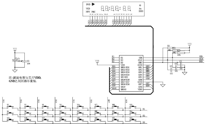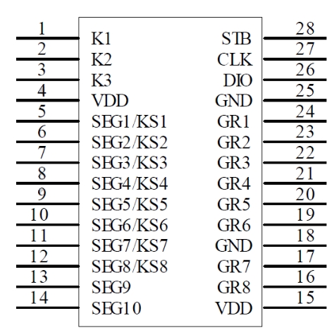 MCU數(shù)字接口:包括CLK(時鐘輸入)、DIO(數(shù)據(jù)輸入/輸出)、STB(片選)等引腳,用于與微控制器進行通信。
