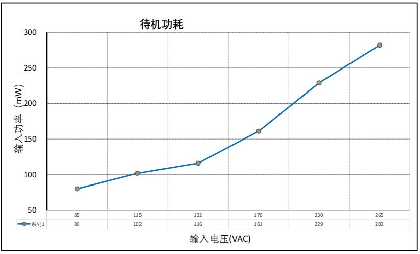 在 230VAC 輸入下,包含 1kΩ 假負載的待機功耗為 229mW,滿足大多數應用場景的低功耗要求。