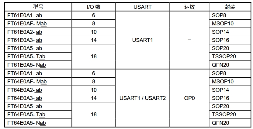 注:FT61E0A為同系列簡(jiǎn)化版(無(wú)USART2和運(yùn)放),型號(hào)僅差一位“1”。