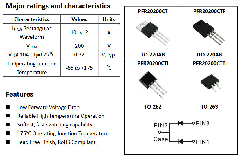在中大功率開關電源、PFC 升壓電路或逆變器次級整流中,總有一顆“黑扁”TO-220 封裝器件被工程師們反復提到——它就是 PFR20200CTF。很多人第一次聽到這個料號時都會疑惑:它到底是三極管還是 MOS?其實,它是一顆把“肖特基”和“MOS 結構”揉在一起的功率整流二極管,由 PFC Device Inc. 推出,主打 200 V/20 A、超低正向壓降(Low VF)和快恢復特性,下面帶你一次性把它摸透。