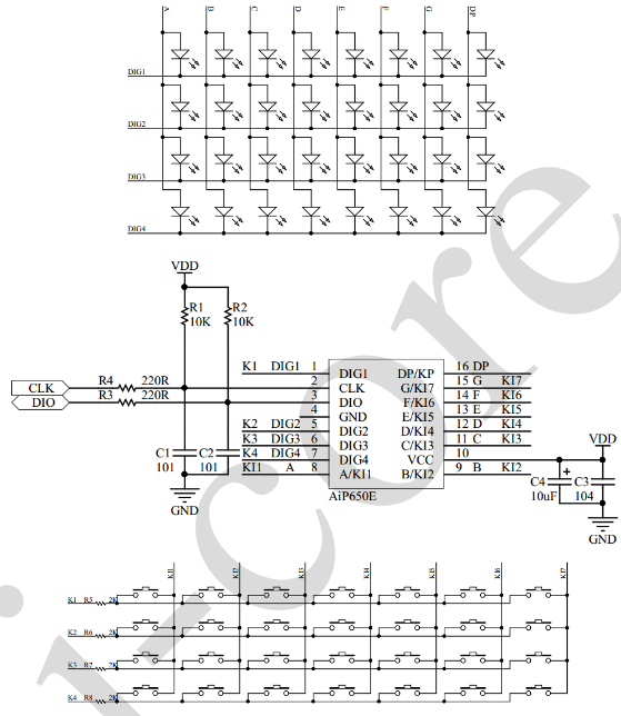 AiP650E的內(nèi)部架構(gòu)體現(xiàn)了"顯示與按鍵分時復(fù)用"的智能設(shè)計理念: