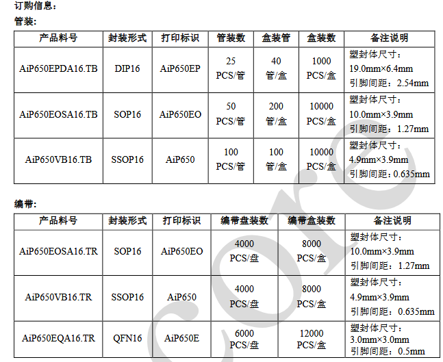 | SSOP16 | AiP650 | 省略封裝標(biāo)識,需結(jié)合外形區(qū)分 |