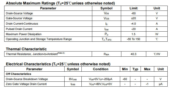 | Qg(總柵極電荷) | VDS=-30V, ID=-4A | 25nC | 開關(guān)損耗低,適合高頻PWM |