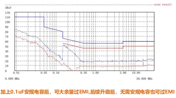 YD925在半波整流+0.1μF電容條件下即可通過EMI測試,無需額外共模電感,進一步壓縮成本和體積。