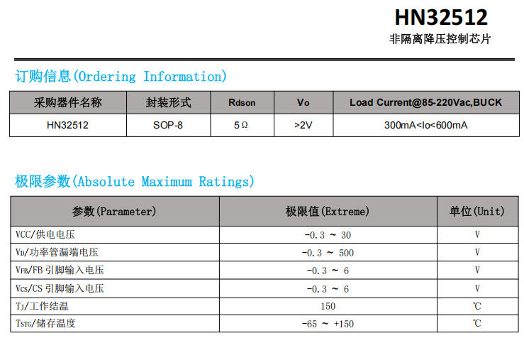 HN32512是一款非隔離降壓型電源控制芯片,采用SOP-8封裝,內(nèi)置500V耐壓的NMOS功率管,最大輸出電流300mA。它能把220V交流電直接轉(zhuǎn)換成穩(wěn)定的直流電壓,特別適合小家電、小風(fēng)扇等低成本應(yīng)用場景。