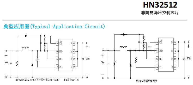 HN32512的典型應(yīng)用是BUCK降壓電路,直接從220V交流整流后的高壓直流取電,降壓輸出12V或更低電壓。
