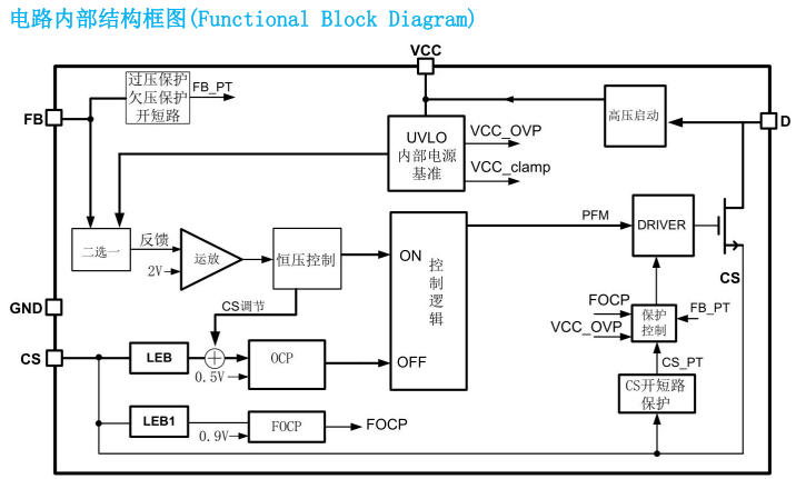 VCC過壓/欠壓保護(hù):VCC高于28V或低于7.2V時停止工作,防止異常工況。