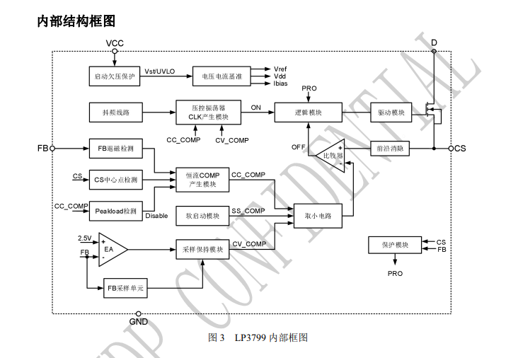 LP3799FBC 內(nèi)部集成大于 650V 高壓功率管,采用特有的檢測方式和算法,系統(tǒng)可以工作在恒壓和恒流兩種狀態(tài)。