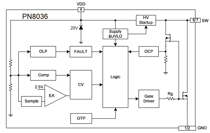 PN8036寬輸出范圍非隔離交直流轉換芯片 ,集成PFM控制器及650V高雪崩能力智能功率MOSFET,用于外圍元器件極精簡的小功率非隔離開關電源。PN8036內(nèi)置650V高壓啟動模塊,實現(xiàn)系統(tǒng)快速啟動、超低待機功能。該芯片提供了完整的智能化保護功能,包括過流保護,欠壓保護,過溫保護,另外PN8036的降頻調(diào)制技術有助于改善EMI特性。、
