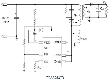 復合模式的應用使得芯片能夠實現(xiàn)低靜態(tài)功耗、低音頻噪音、高效率。而且高集成的功率 MOSFET 能夠降低外部 PCB的面積以及系統(tǒng)的成本。PL3328C 同時具有多種保護功能:逐周期峰值電流檢測、欠壓保護、過壓保護等。