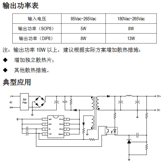 輸出功率(DIP8) 85Vac~265Vac :8W, 180Vac~265Vac:13W