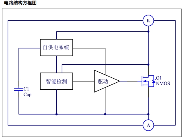 DK5V100R10HM是一款簡單高效率的同步整流芯片,只有A,K兩個引腳,分別對應肖特基二極管的PN管腳。芯片內部集成了100V功率NMOS管,可以大幅降低二極管導通損耗,提高整機效率,取代或替換目前市場上等規的肖特基整流二極管。DK5V100R10HM采用SM-10封裝。內部框架圖如下所示~