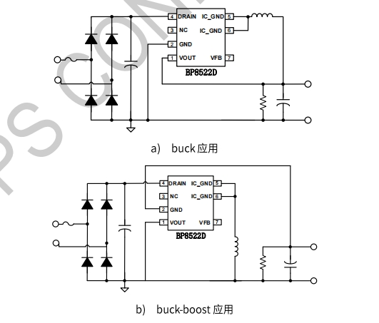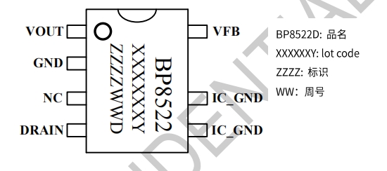 BP8522D的應(yīng)用領(lǐng)域廣泛,包括小家電輔助電源、電機(jī)驅(qū)動(dòng)輔助電源、IOT/智能家居/智能照明等。其典型應(yīng)用原理圖和封裝信息如下圖所示: