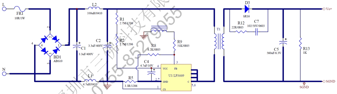 電路設計:LP3669A適用于雙繞組原邊反饋控制,系統工作于斷續模式,適用于充電器和適配器以及其他輔助類電源。LP3669A采用特有的輸出線損補償技術,可以有效的補償輸出電流在輸出線上的損耗壓降;恒壓時,采用谷底導通技術,提升恒壓效率。