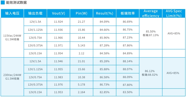 在115VAC輸入下,12V1.5A輸出時,效率最高可達87.28%,平均效率為86.89%。