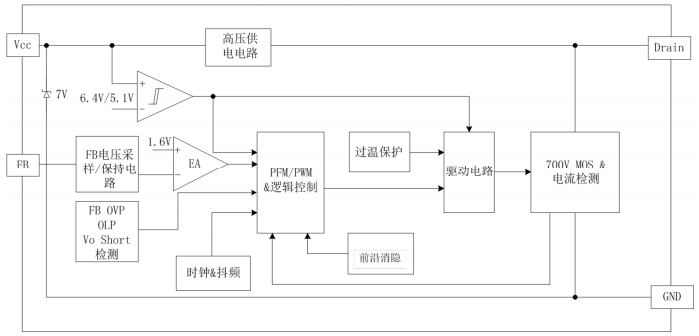 BP8519C在系統(tǒng)上電后,BUS電容通過功率管給VCC電容充電,當VCC電壓達到芯片開啟閾值后,芯片內部控制電路開始工作。芯片內置7V穩(wěn)壓管,用于VCC電壓鉗位。FB引腳通過采樣電阻在芯片功率管turnoff階段直接采樣輸出電壓,內部調節(jié)保持較高的輸出電壓精度。