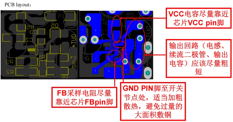 VCC電容應盡量靠近芯片VCC引腳,輸出回路(電感、續(xù)流二極管、輸出電容)應盡量粗短,F(xiàn)B采樣電阻應盡量靠近芯片F(xiàn)B引腳,GND引腳至開關節(jié)點處,適當加粗散熱,避免過量的大面積敷銅。